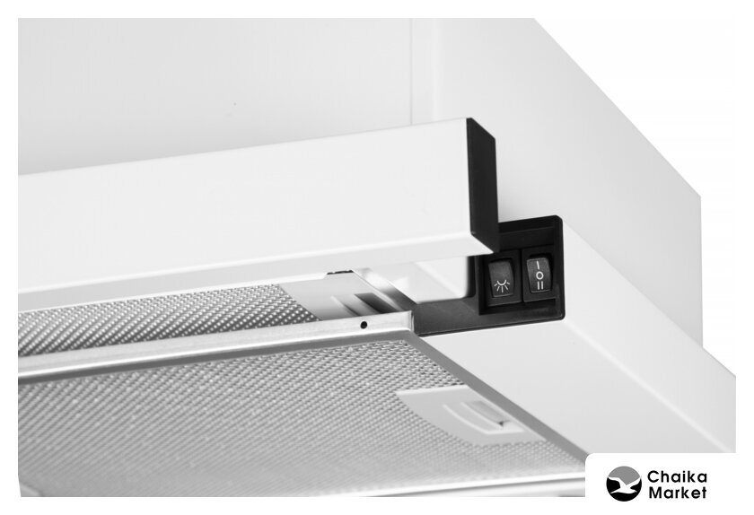 конструкция плоская, монтаж настенный, управление механическое/кнопочное, производительность вытяжки 300 м³/ч, ширина 60 см