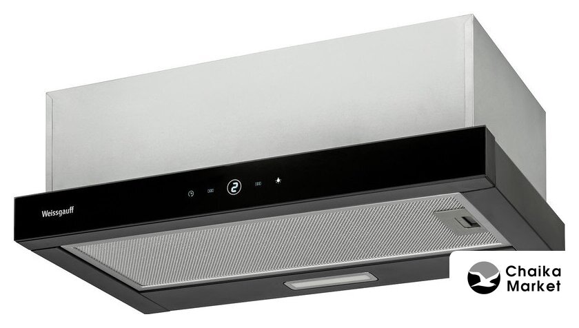 конструкция скрытая, монтаж для встраивания, ширина 59.8 см, управление механическое/кнопочное, производительность мотора 750 м³/ч, цвет черный