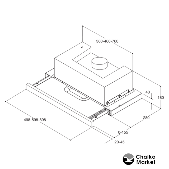 монтаж для встраивания, управление кнопочное, производительность мотора 367 м³/ч, ширина 55 см