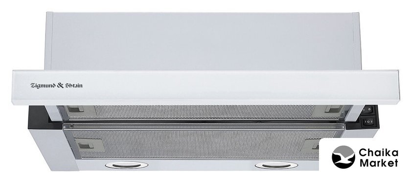 конструкция телескопическая, монтаж для встраивания, ширина 59.8 см, управление механическое/кнопочное, производительность мотора 670 м³/ч, цвет белый/серый