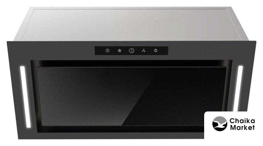 конструкция скрытая, монтаж для встраивания, ширина 59.8 см, управление механическое/кнопочное, производительность мотора 1050 м³/ч, цвет черный