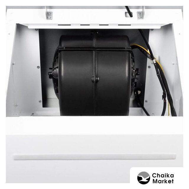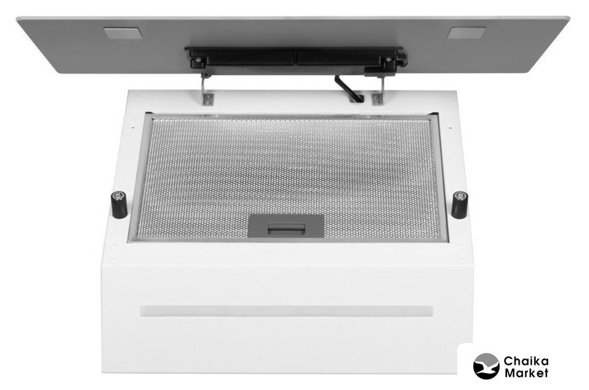 конструкция купольная, монтаж настенный, ширина 59.8 см, управление механическое/кнопочное, производительность мотора 800 м³/ч, цвет белый