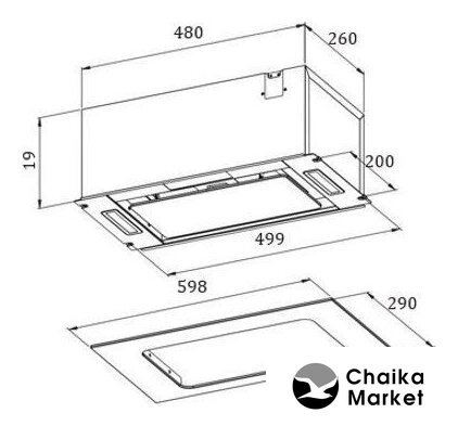 конструкция скрытая, монтаж для встраивания, ширина 59.8 см, управление сенсорное/жестами, производительность мотора 1020 м³/ч, цвет черный
