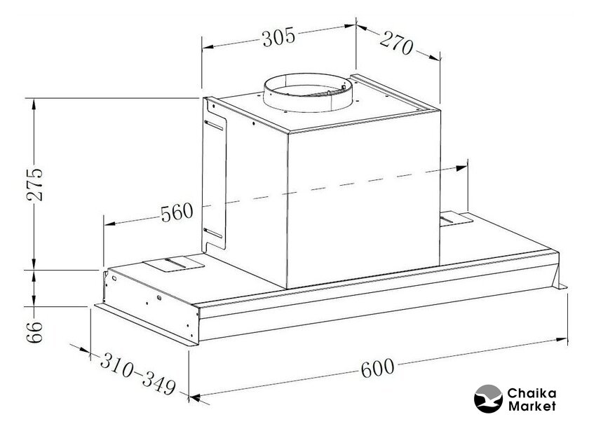 конструкция наклонная, монтаж настенный, управление механическое/кнопочное, производительность мотора 750 м³/ч, ширина 59.6 см
