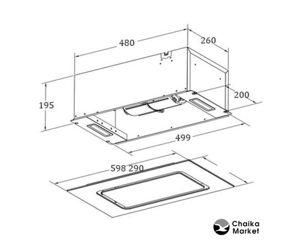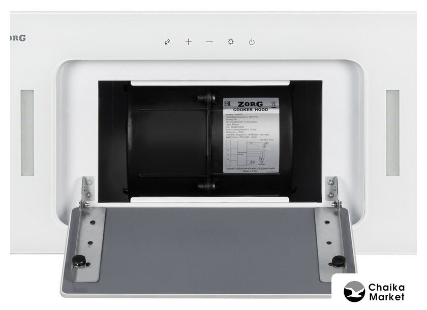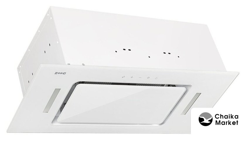 конструкция скрытая, монтаж для встраивания, ширина 59.8 см, управление механическое/поворотный переключатель, производительность мотора 850 м³/ч, цвет белый