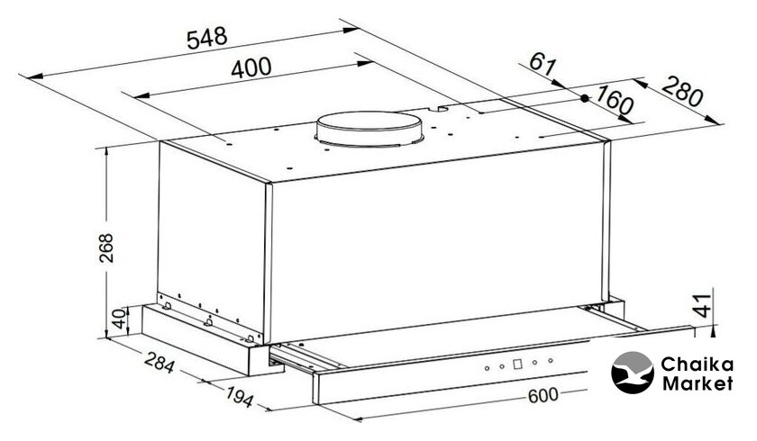 конструкция Т-образная, монтаж настенный, ширина 60 см, управление сенсорное, производительность мотора 800 м³/ч, цвет нержавеющая сталь/черный
