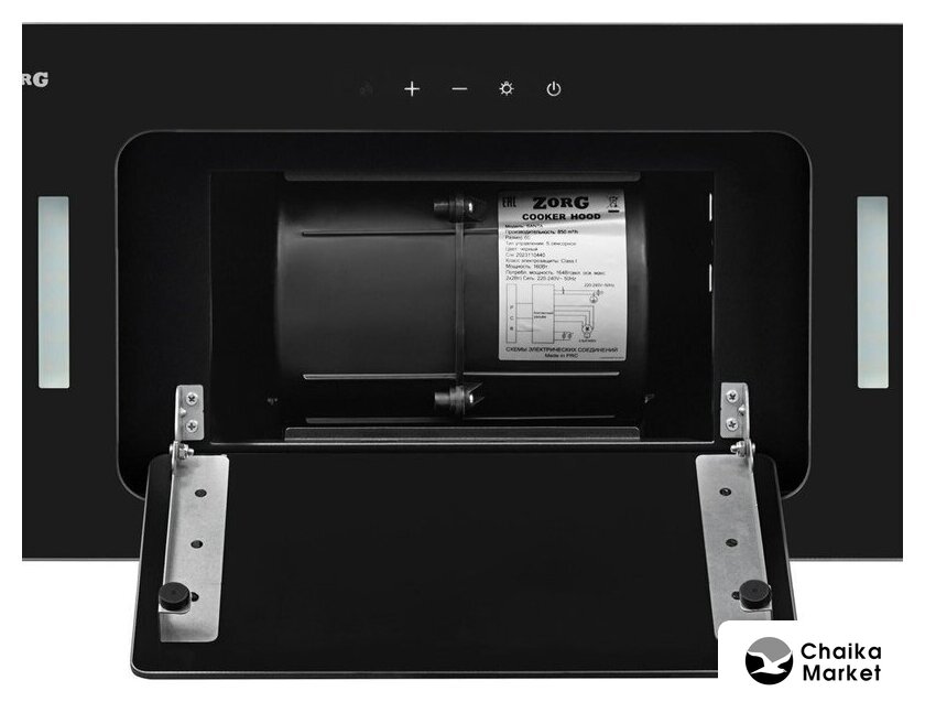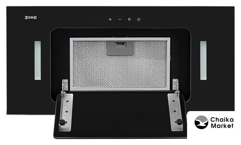 конструкция наклонная, монтаж настенный, ширина 60 см, управление механическое/кнопочное, производительность мотора 850 м³/ч, цвет нержавеющая сталь/черный