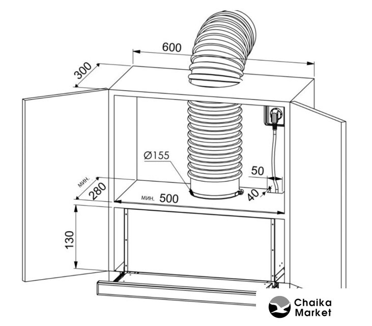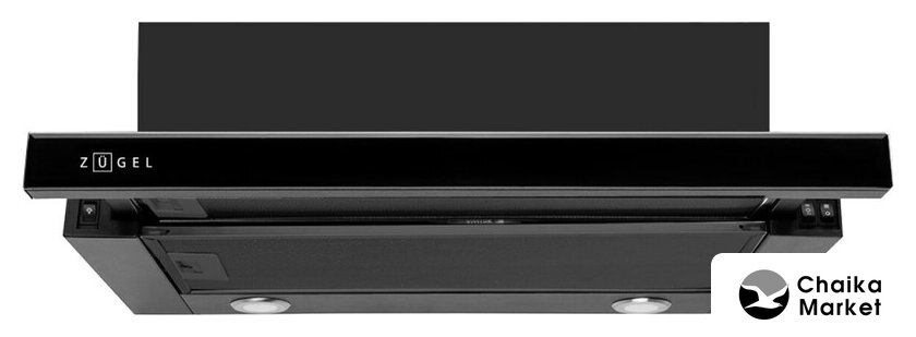 конструкция скрытая, монтаж для встраивания, ширина 60 см, управление механическое/слайдерное, производительность мотора 850 м³/ч, цвет черный