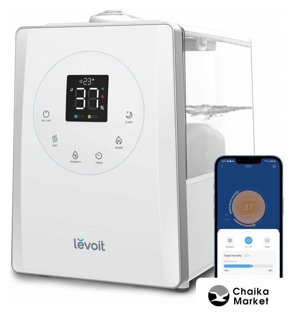 ультразвуковой, помещение до 47 м², производительность 300 мл/ч, резервуар 6 л, гигростат, Amazon Alexa/Google Home/фирменное приложение, ароматизация, шум 28 дБ, цвет белый/синий