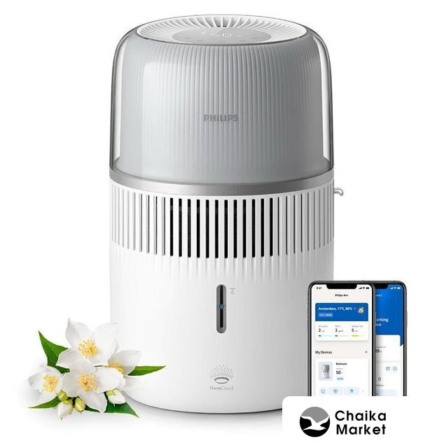 холодный пар (традиционный), помещение до 30 м², производительность 200 мл/ч, резервуар 3 л, Amazon Alexa/Apple HomeKit/Google Home, гигростат, шум 50 дБ, цвет белый/прозрачный