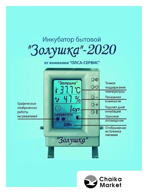 инкубационный, автоматический поворот яиц, цифровой терморегулятор, 32-42 °C, гигрометр, питание: сеть, потребляемая мощность 10-25 Вт