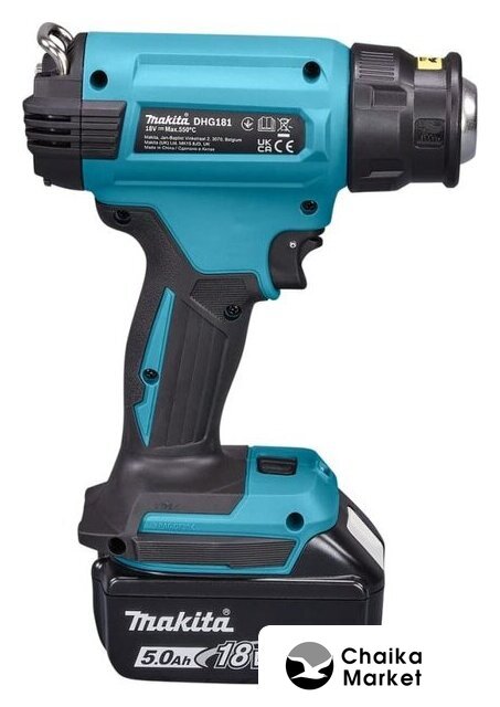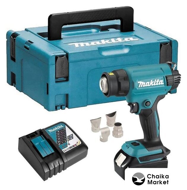 Комплект поставки | - Термовоздуходувка- Широкое сопло с широкой щелью - Широкое сопло с узкой щелью - Сопло с отражателем - Широкое сопло - Кейс Makpac тип 2- Зарядное устройство Makita DC18RC (14,4-18В, Li-Ion)- Аккумулятор Makita BL1850B (18В, 5.0Ач, Li-Ion) |
