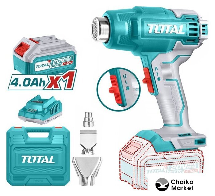 Комплект поставки | - Термовоздуходувка - 1 шт.- Аккумулятор 4,0 Ач - 1 шт.- Зарядное устройство 2 А - 1 шт.- Насадка - 3 шт.- Кейс |