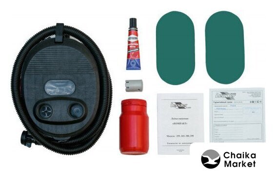 Комплектация | весло (2 шт., разъемные алюминиевые 160 см), насос (5 л), транец, ремкомплект, сумка упаковочная (сумка-чемодан), банка (сиденье) (2 шт.), настил |