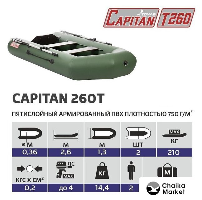 гребная лодка, дно: надувное (airdeck), ПВХ 750 г/кв.м, транца нет, грузоподъёмность: 210 кг, 2 места, 2.6x1.23 м, 13.7 кг