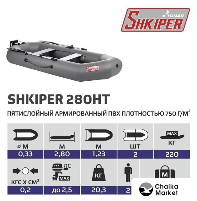 моторно-гребная лодка, дно: реечное (слань), ПВХ 750 г/кв.м, навесной транец, грузоподъёмность: 220 кг, 2 места, 2.8x1.23 м, 17.6 кг
