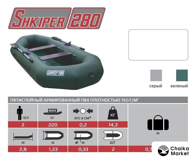 гребная лодка, дно: без настила, ПВХ 750 г/кв.м, транца нет, грузоподъёмность: 220 кг, 2 места, 2.62x1.2 м, 14 кг