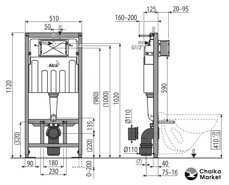 крепление на капитальную стену/на пол/на некапитальную стену, макс. нагрузка 400 кг, двухрежимный слив, бачок в комплекте, 50x115x14.5 см