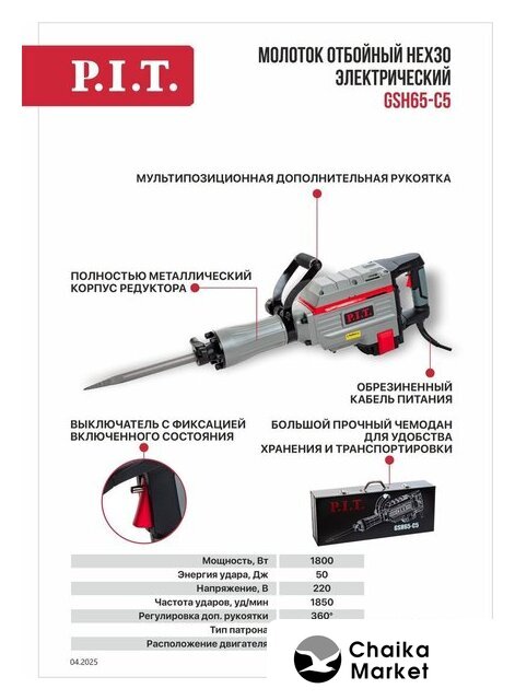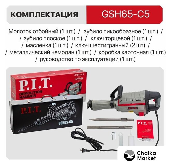 | Комплектация | - Молоток отбойный, - зубило пикообразное, - зубило плоское, - ключ торцевой, - масленка, - ключ шестигранный (2шт), - металлический чемодан, - щетки угольные, - руководство по эксплуатации. |