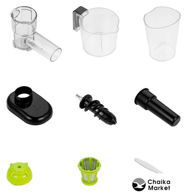 Комплектация | Соковыжималка:моторный отсек - 1 штотжимной блок - 1 штшнек - 1 штфильтр - 1 штзажим - 1 штЛоток - 1 штТолкатель - 1 штКонтейнер для сока - 1 штКонтейнер для жмыха - 1 штЩётка для чистки - 1 штРуководство по эксплуатации - 1 штГарантийный талон - 1 шт |