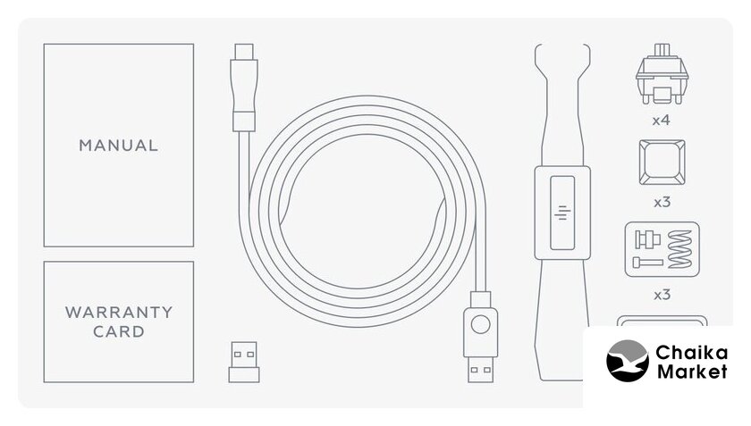 | Комплект поставки | - 4 сменных переключателя- 3 сменных кейкапа- USB ресивер- пуллер для для кейкапов/переключателей - кабель USB Type-C - USB Type-A- 4 резиновых накладки- дополнительные пружины, винты, вставки- документация |