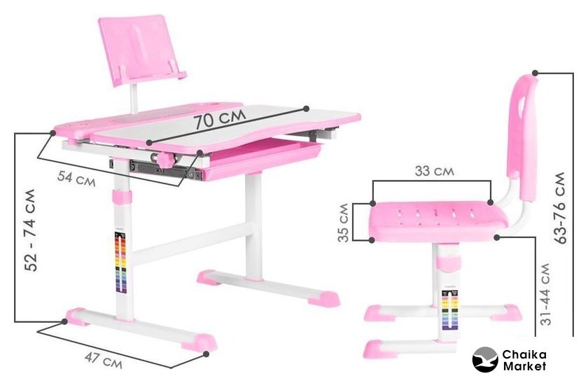 парта (1 стул в комплекте), для детей 3 лет, 70×54 см, материал: МДФ, материал стула: металл + пластик, регулировка высоты, регулировка наклона