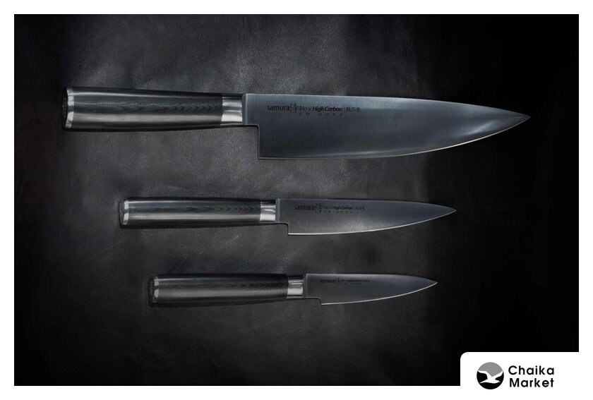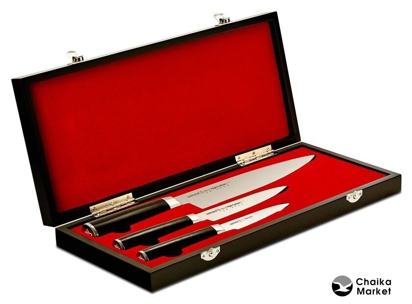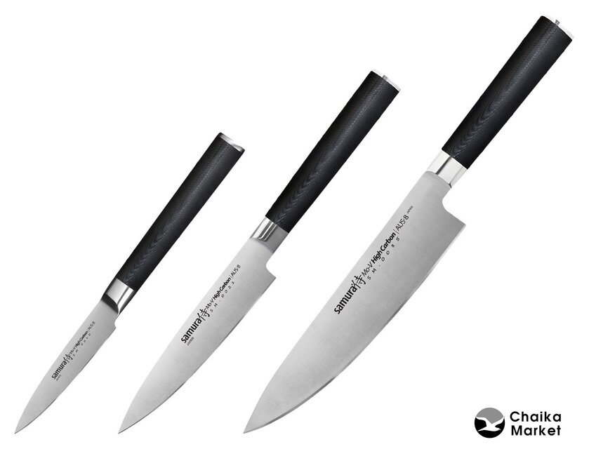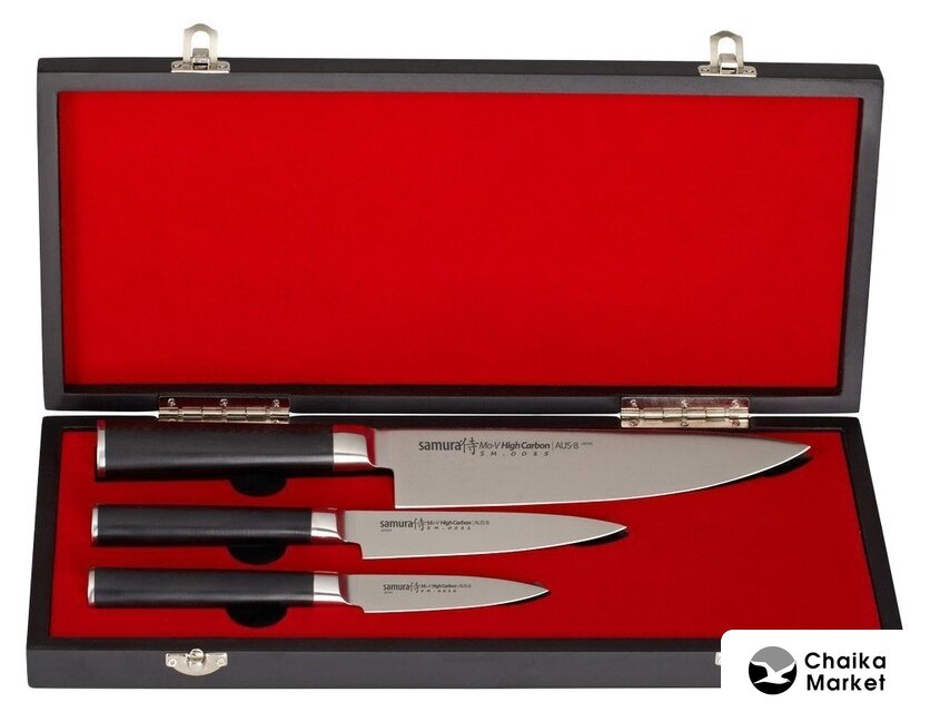 Комплектация | SM-0010 - НОЖ ОВОЩНОЙ 80 ммSM-0021 - НОЖ УНИВЕРСАЛЬНЫЙ 125 мм SM-0085 - НОЖ ШЕФ 200 мм |