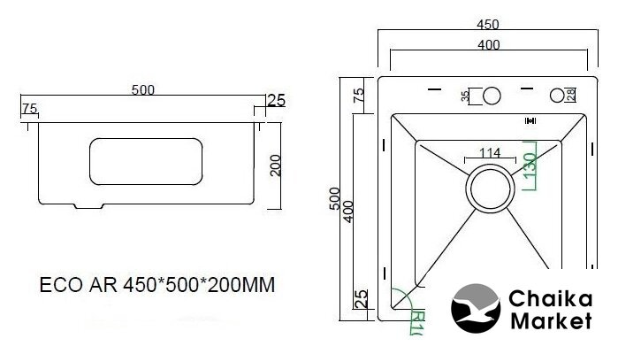 врезная на столешницу, нержавеющая сталь, размеры: 45x50 см