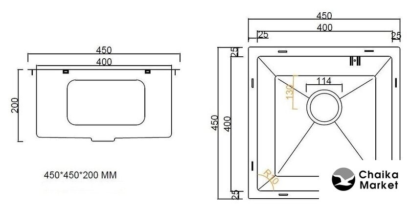 врезная под столешницу, нержавеющая сталь, размеры: 45x45 см