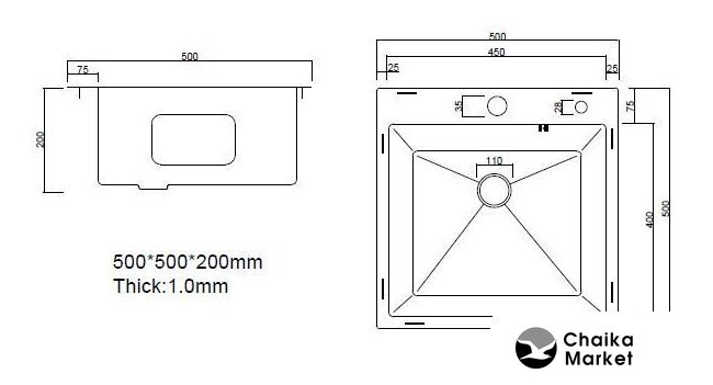 врезная на столешницу, нержавеющая сталь, размеры: 50x50 см, в шкаф 60 см