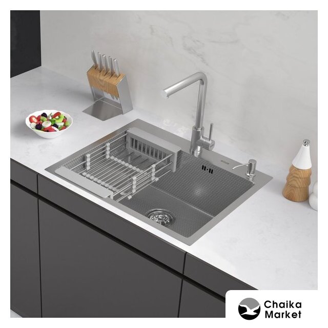 Кухонная мойка Saniteco 6050 Nano (с сифоном, дозатором и коландером) — Chaika Market
