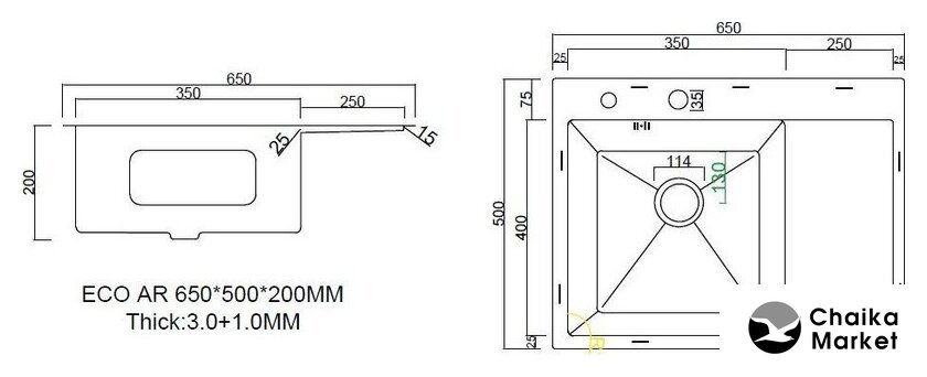 врезная на столешницу, нержавеющая сталь, размеры: 65x50 см