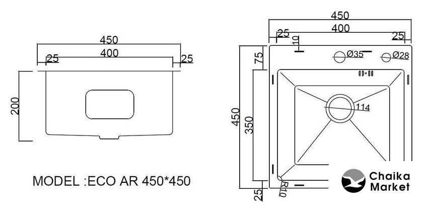 врезная под столешницу, нержавеющая сталь, фактура: матовая, размеры: 45x45 см, глубина чаши: 20 см