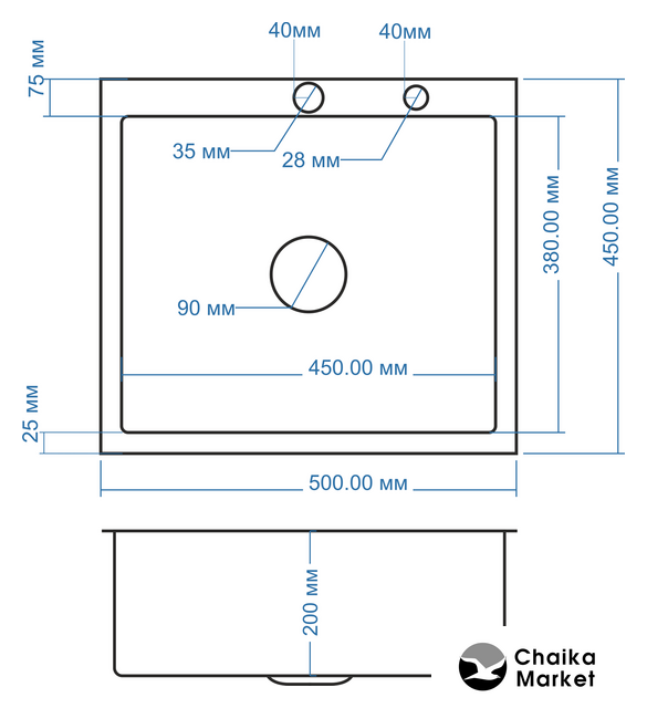 врезная на столешницу, нержавеющая сталь, фактура: матовая, размеры: 50x50 см, глубина чаши: 20 см, в шкаф шириной от 50 см