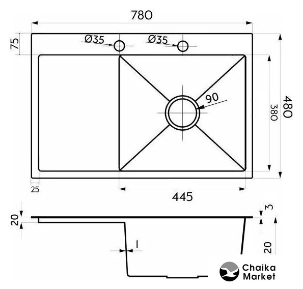 нержавеющая сталь, фактура: полированная, размеры: 44x54 см, глубина чаши: 20 см, в шкаф шириной от 60 см
