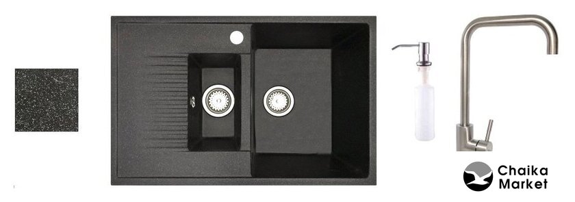 Комплектация | смеситель, кухонная мойка, дозатор для жидкого мыла |