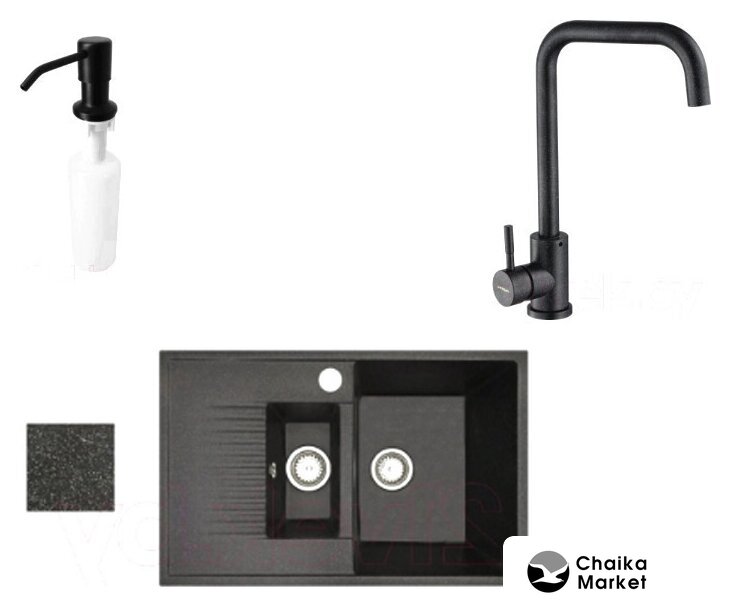 Комплектация | смеситель, кухонная мойка, дозатор для жидкого мыла |