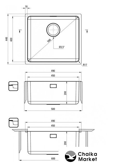 врезная на столешницу, нержавеющая сталь, фактура: матовая, размеры: 45x50.5 см, глубина чаши: 20 см