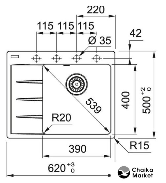 врезная на столешницу, искусственный камень, размеры: 62x50 см, глубина чаши: 20 см, в шкаф шириной от 45 см, клапан-автомат