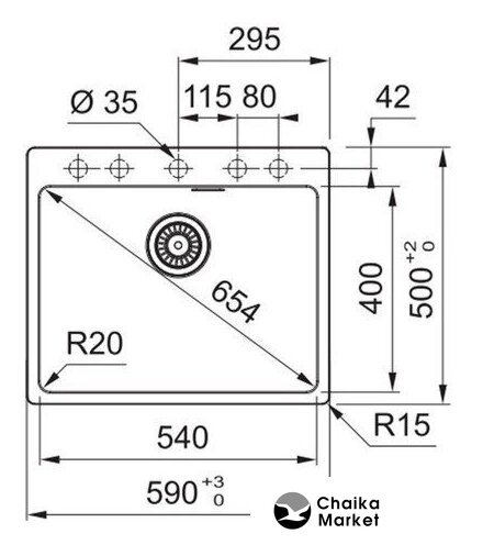 врезная на столешницу, нержавеющая сталь, размеры: 59x51 см, глубина чаши: 20 см, в шкаф шириной от 45 см