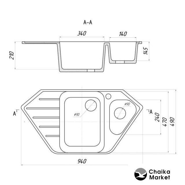 врезная на столешницу, искусственный камень, размеры: 95x50 см