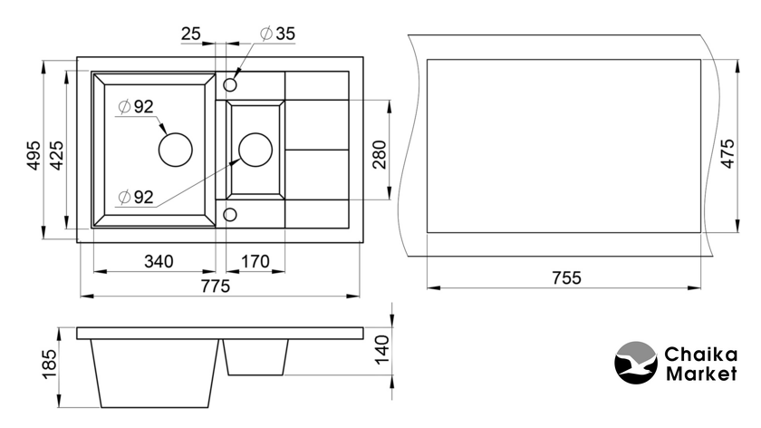 врезная на столешницу, искусственный камень, размеры: 77.5x49.5 см, в шкаф 60 см