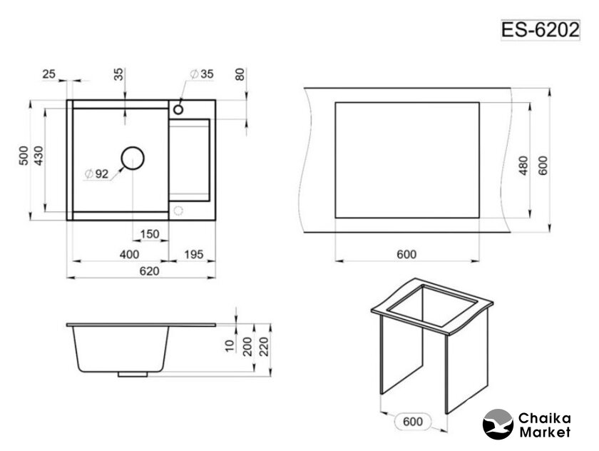 врезная на столешницу, искусственный камень, размеры: 50x62 см, в шкаф 60 см