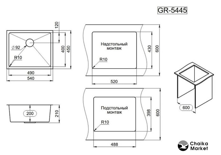 врезная под столешницу, искусственный камень, размеры: 53x46 см, глубина чаши: 19 см, в шкаф шириной от 50 см