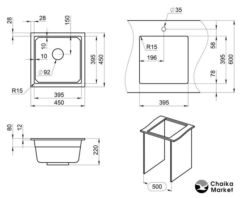 врезная под столешницу, кварц, размеры: 45x45 см, в шкаф 50 см