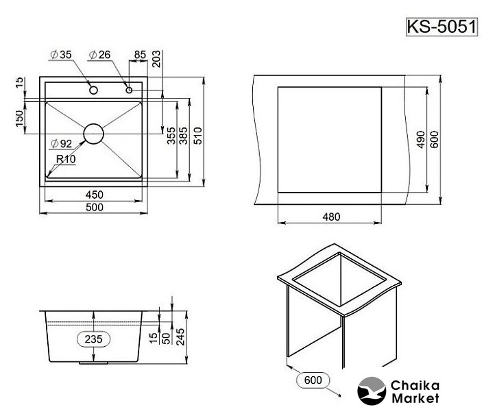 врезная на столешницу, нержавеющая сталь, фактура: полированная, размеры: 51x51 см, глубина чаши: 20 см, в шкаф шириной от 50 см