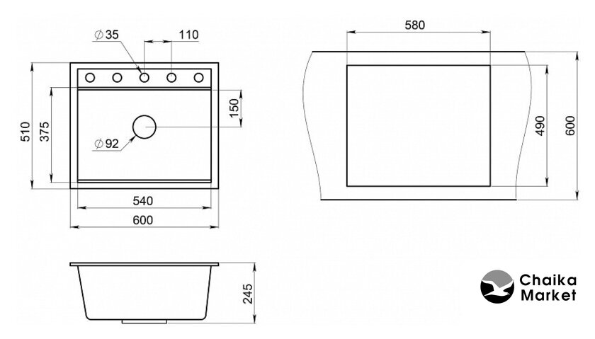 врезная на столешницу, искусственный камень, размеры: 60x51 см, в шкаф 60 см