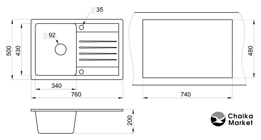 врезная на столешницу, кварц, размеры: 76x50 см, в шкаф 45 см