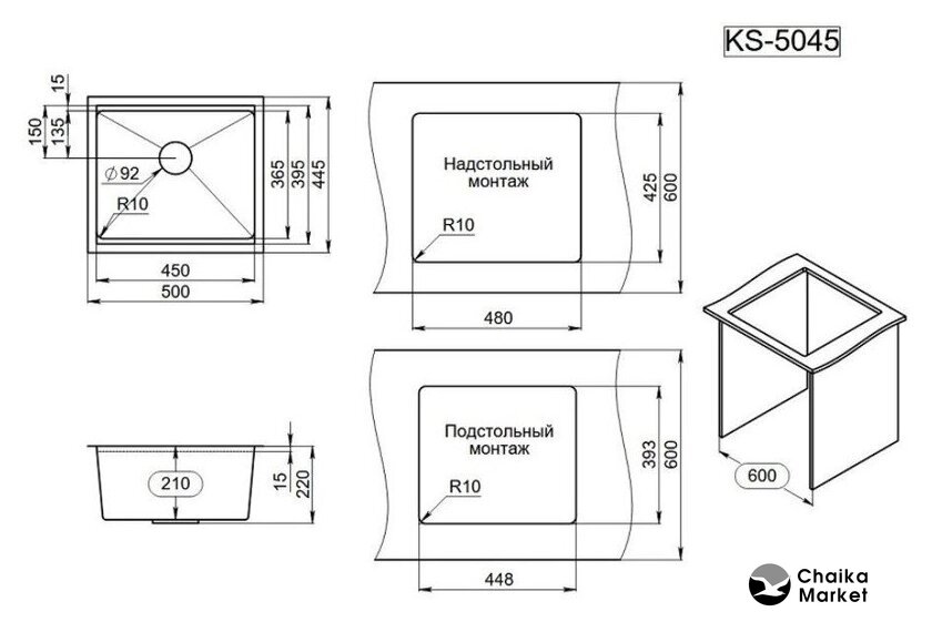 врезная на столешницу/врезная под столешницу/врезная вровень со столешницей, нержавеющая сталь, размеры: 48x44 см, глубина чаши: 20 см, в шкаф шириной от 60 см