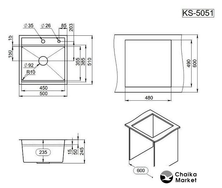 врезная на столешницу, нержавеющая сталь, фактура: матовая, размеры: 51x50 см, глубина чаши: 23.5 см, в шкаф шириной от 60 см